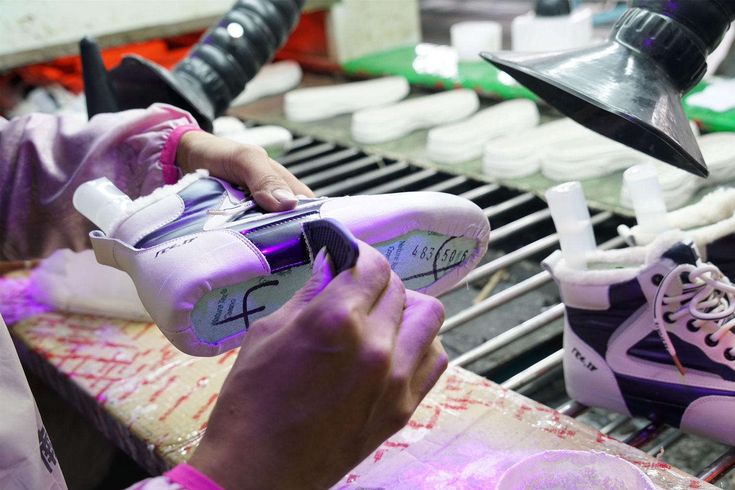 記者來(lái)到制鞋車(chē)間內(nèi),工人們正熱火朝天地忙碌著。記者在現(xiàn)場(chǎng)看到,在刷膠這道工序中,工人們都在一個(gè)集氣罩下進(jìn)行操作。